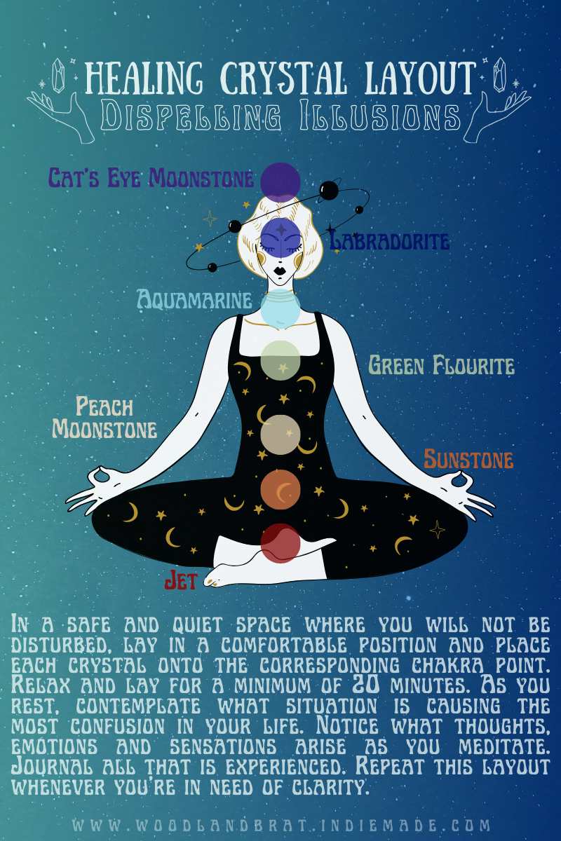 This healing layout below was created to assist in dispelling illusions. Sometimes we have a hard time connecting to our intuition due to external influences clouding our internal sight. The crystals utilized in this layout are commonly used for removing hooks (energetic influences) from the mind, emotions, spirit and body; stimulate intuition and ground one’s energy.